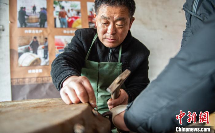 2月27日,付俊魁和助手正在固定鼓皮。李金刚摄
