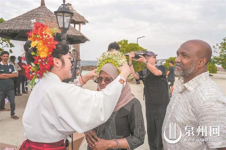 活动还特别设置了泉州蟳埔簪花围体验区,让各国游客能够亲身体验福建的民俗文化特色。现场人头攒动,观众纷纷戴上五彩缤纷的泉州蟳埔簪花围,簪百色鲜花,传非遗风采。作为国家非物质文化遗产蟳埔女习俗的重要组成,蟳埔簪花围承载着福建千年海丝文化的历史记忆,它亦是一种独特的文化符号,成为连接中国与马尔代夫之间的文化桥。