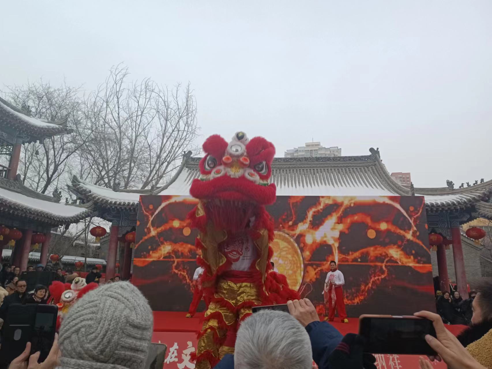 乌鲁木齐文庙文化庙会上,国家级非物质文化遗产广东醒狮项目代表性传承人赵伟斌及其团队的《醒·狮》表演。资料图