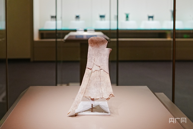 刻辞卜骨,安阳小屯南地甲骨窖穴发现,上面发现了93个单字(央广网记者张羲轮摄)