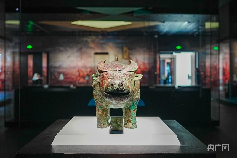 “亚长”牛尊,牛尊造型为写实的水牛,牛身布满龙、虎、鸟、鱼等动物纹饰,牛颈部下方及器盖内壁有铭文“亚长”(央广网记者张羲轮摄)