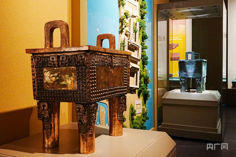新铸造的青铜器呈现出金色光泽,殷墟博物馆新馆将司母辛鼎复制品与真实文物的并列对比(央广网记者张羲轮摄)
