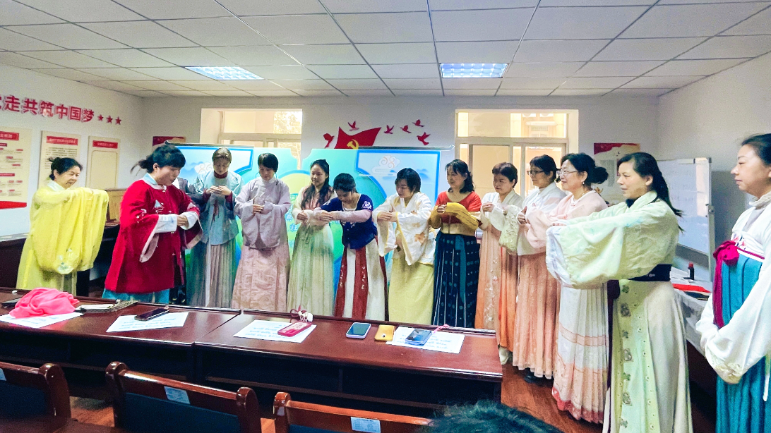 活动中,居民换上自己喜爱的汉服,装扮过后,大家学习起了各朝代所着汉服的特色及相应礼仪。现场,国学老师为大家讲解了传统礼节,在端正衣冠、拱手礼、叩首礼等一招一式的传统礼仪中,居民们感受到了传统文化的魅力。