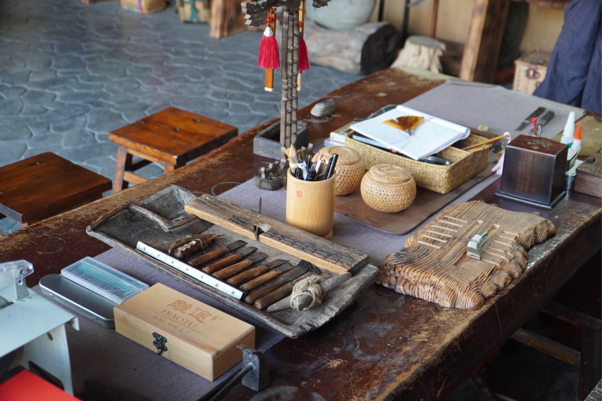 羌笛制作工具台(央广网记者 昌思荣 摄)
