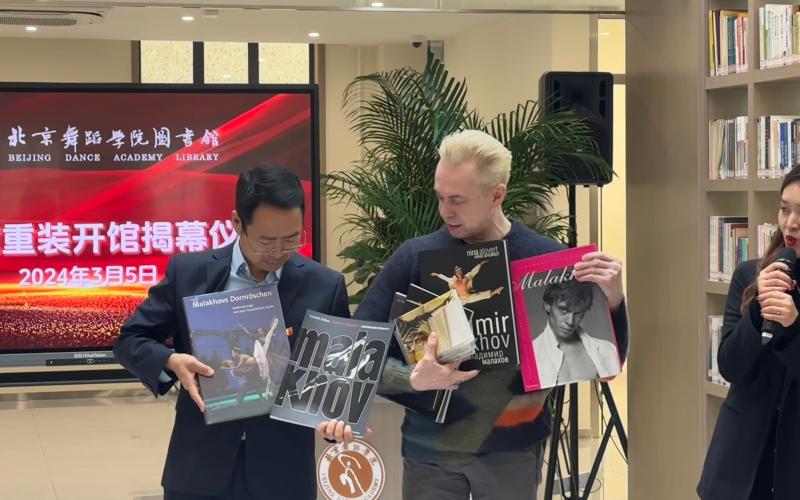 在当日上午的开馆揭幕仪式上,国际著名芭蕾舞蹈艺术家、北京舞蹈学院芭蕾舞系特聘教授弗拉基米尔·马拉霍夫特别赠送了图书和音像制品,主要是他的自传及艺术作品,希望能够给学生们鼓舞和借鉴。