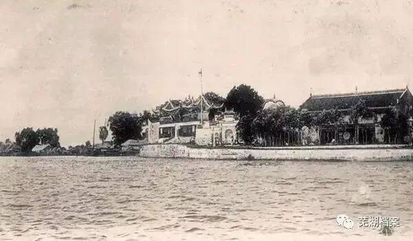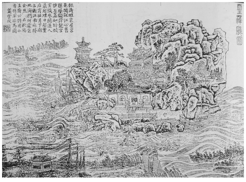明末清初萧云从《太平山水图·灵泽矶图》元代,“蛟矶烟浪”被主政芜湖的欧阳玄定名为“芜湖八景”之一,世人称绝。 “龙章凤驾出皇都,蛟矶烟锁在芜湖。”明太祖朱元璋因感念蛟矶娘娘护佑,赐建蛟矶庙山门牌坊匾额还愿,并将这里称为“蛟矶烟锁”,至今遗址尚存。据民国版《无为县志》载:“庙中有香木雕冕旒蟒服,丽若天人。后有蜀望台,凭窗西眺,目穷千里,江流呜咽,令人低回流连而不忍舍……”。