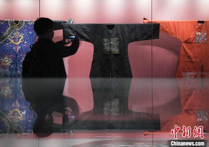 图为:清朝石青暗花绸补褂吸引参观者。王刚 摄