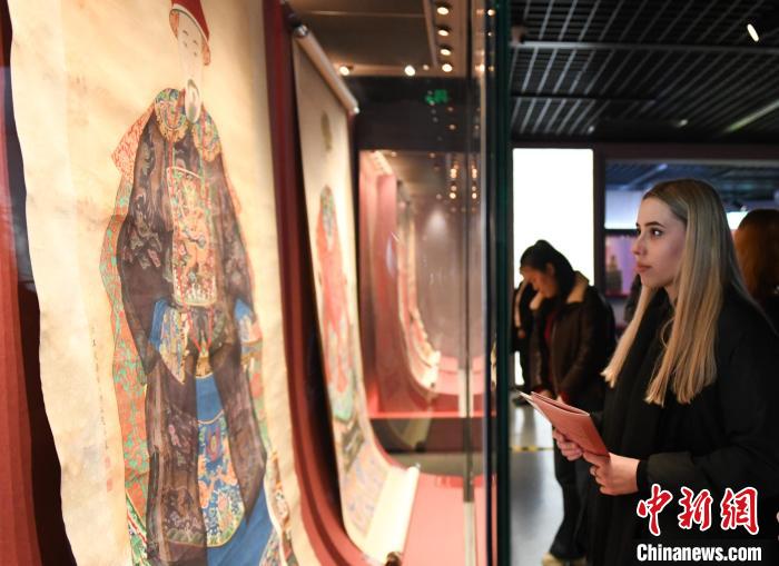 图为:清朝六十八代衍圣公孔传铎衣冠像轴吸引外籍留学生。王刚 摄