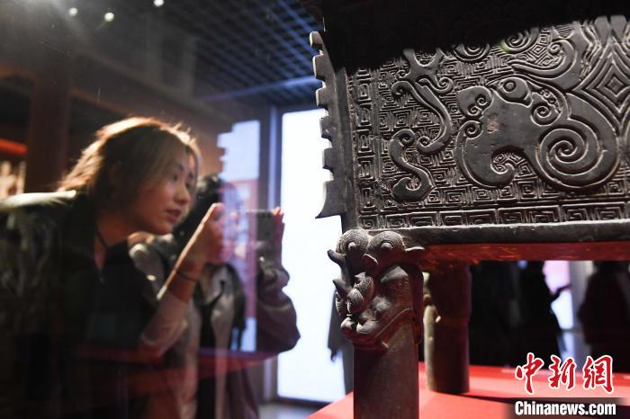 图为:明朝成化夔龙纹大方鼎吸引外籍留学生。王刚 摄