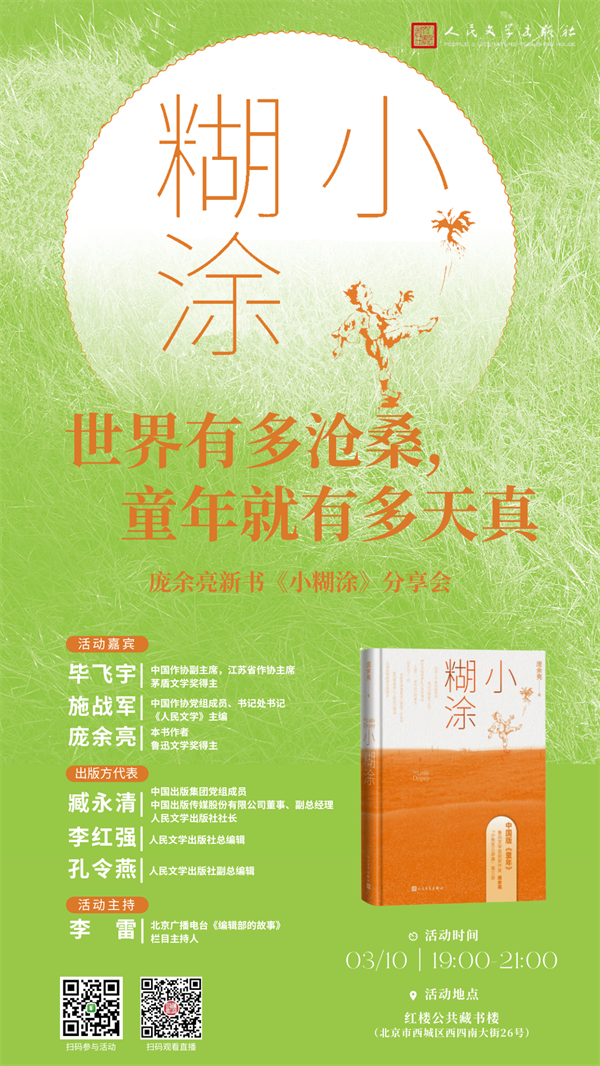 这个春天,在《小先生》《小虫子》之后,第八届鲁迅文学奖得主、作家庞余亮如约捧出了《小糊涂》。这是“小先生三部曲”的收官之作,是新奇的饥饿之书,也是深情的母爱之书,被誉为中国版《童年》。3月10日晚,著名作家毕飞宇和著名评论家施战军将与《小糊涂》的作者庞余亮一起,在沧桑的世界的边缘,在这个崭新的北京春天里,在北京红楼公共藏书楼,与大家一起重拾童年里的天真。