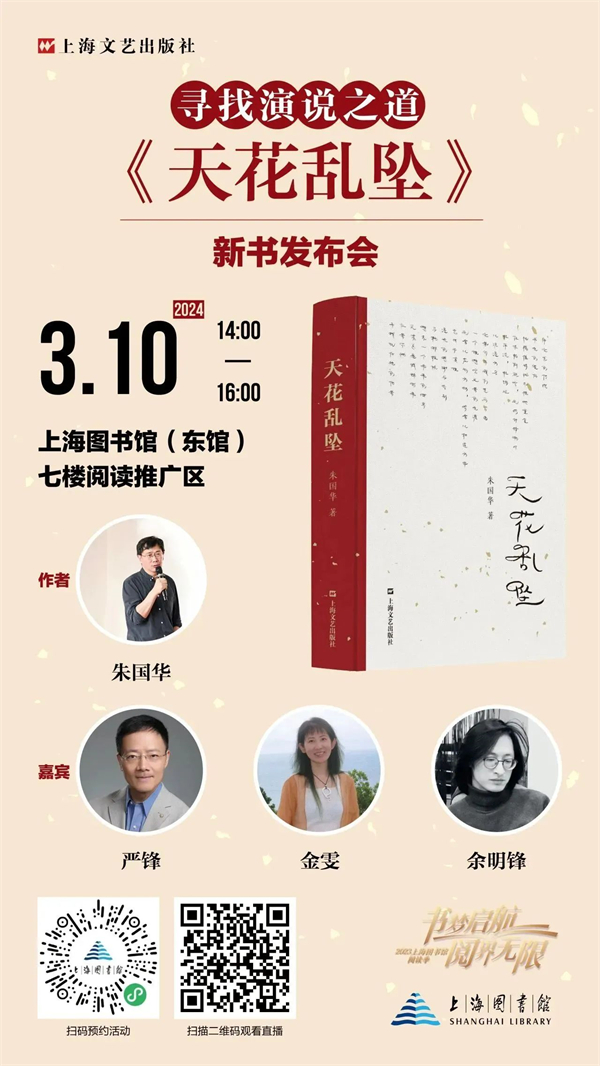 《天花乱坠》是人气教授朱国华首部演讲集。它引导着我们重新做一个骑士,顽强地接受命运抛给我们的难题,追寻前辈思想的群星光辉,采撷吉光片羽仍然具有意义。世界这么大,岁月这么长,道路这么多,作为芸芸众生的一员,我们有权利无往而不乐。3月10日,上海图书馆携手上海文艺出版社一同邀请《天花乱坠》作者朱国华与嘉宾严锋、金雯、余明锋来与读者分享他们对于演说与生活的思考。