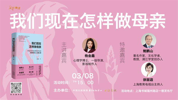 《我们现在怎样做母亲》一书是心理学博士杨金鑫对母亲这一群体展开认真研究之后,针对女性成长的话题有感而发的作品,旨在聚焦母亲、帮助女性成长、为母亲纾困。3月8日下午,我们邀请到杨金鑫以及特邀嘉宾鲍鹏山、徐丽遐,来到上海书店福州路店,举行一场精彩对谈,一起聊聊在当今社会,该怎样做母亲、做什么样的母亲。