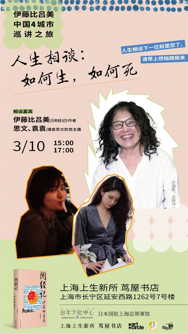 受北京日本文化中心(日本国际交流基金会)邀请,2024年3月10日-17日,诗人、小说家伊藤比吕美女士来华访问,在4个城市进行巡回演讲。首站来到上海上生新所茑屋书店,将是伊藤比吕美第一次与中国读者进行面对面的交流。同时,我们有幸邀请到播客《思文,败类》的两位主播,思文与袁袁,她们二人曾在其节目中,与中国读者精彩分享过阅读《闭经记》(伊藤比吕美代表作随笔集)的感受。1980年代,伊藤老师曾引领女性诗潮,她的育儿随笔也对日本人产生了巨大的影响,作为诗人、作家,她曾移居海外,远程照看父母。而处于人生下半场的伊藤比吕美,又拥有怎样的生存智慧与生死观念呢?