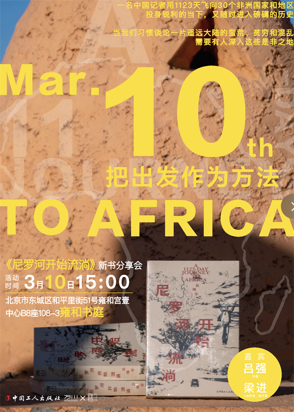 在这本有20余万字和114张图片的书里,作者飞向30个非洲国家和地区,去认识总统、信徒、士兵和路人,去探寻废墟、家园、城堡和灯塔,去看见星空、裂谷、沙漠和海洋。投身锐利的当下,又随时进入磅礴的历史,尝试走近苦难与挣扎,又从中发现希望与可爱,并且始终相信:无穷的远方,无数的人们,都和你我有关。周日下午,《尼罗河开始流淌》作者吕强将和小说作者梁进一起做客雍和书庭,与读者分享旅行中的故事。