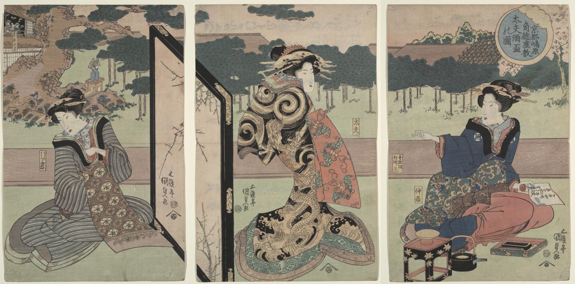 歌川国贞,《京都岛原住德室的名妓》, 三联画,约1844年