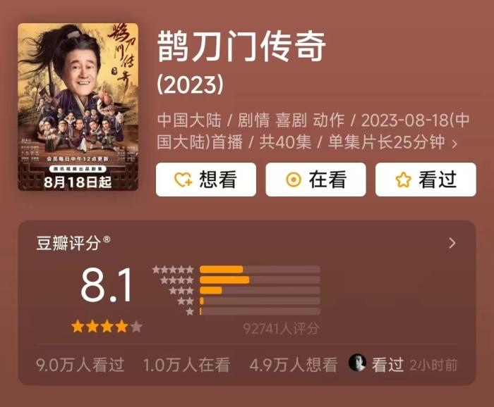 原创武侠剧《鹊刀门传奇》豆瓣评分8.1。豆瓣截图