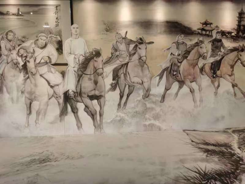 展览入口处,有享誉全球的中国香港漫画家、金庸作品插画、漫画版作者李志清先生为金庸百年纪念展创作的《书剑恩仇录》主题画《海宁观潮图》,主要描绘了陈家洛和乾隆在钱塘江畔抚琴听潮的场景,画面中心是钱塘江滔滔潮水,画面另一边是红花会群雄策马而来的英姿。