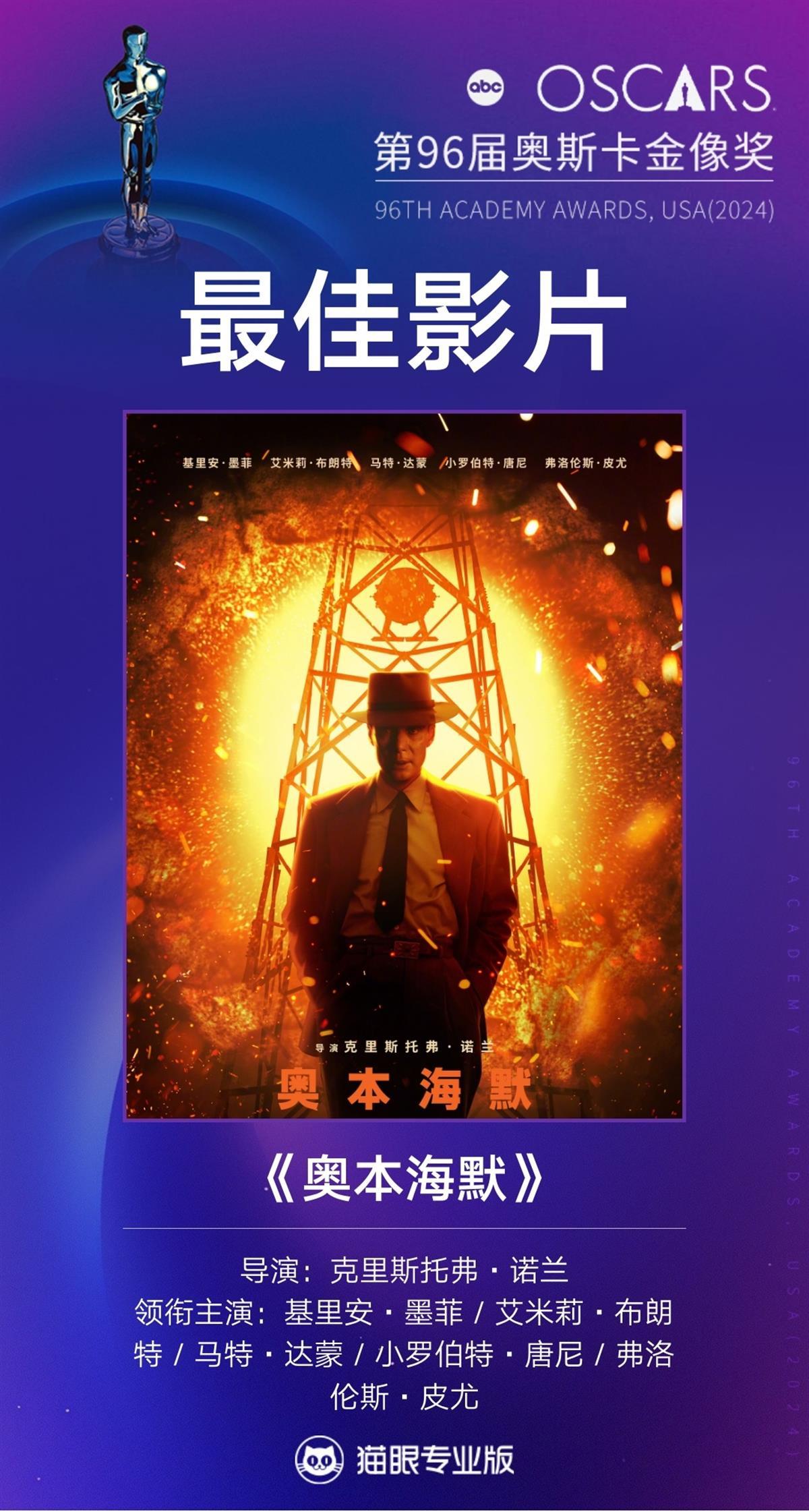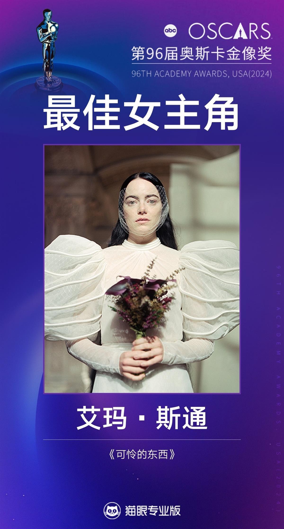 最佳影片、最佳导演、最佳男主角均被《奥本海默》剧组拿下,好在最佳女主角的提名人中没有《奥本海默》的演员。最终,中国影迷分外熟悉的“石头姐”、好莱坞著名女演员艾玛·斯通凭借《可怜的东西》斩获这项殊荣,这也是她继音乐歌舞片《爱乐之城》后,再次获得奥斯卡奖最佳女主角荣誉,我们的“石头姐”又发光了。(图片来源:猫眼专业版公开资料)