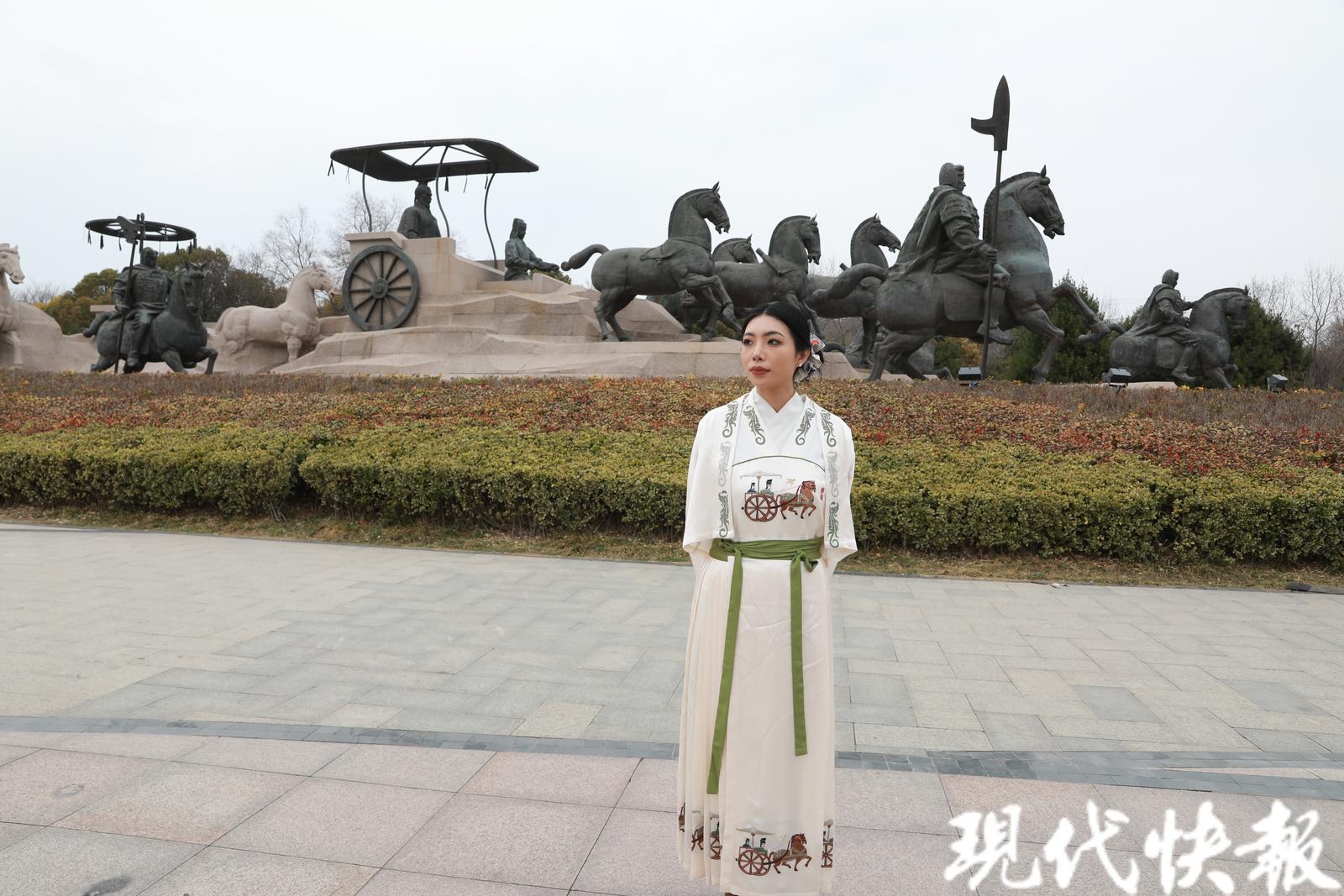 在徐州汉文化景区,有一个《车马出行图》雕塑,也是徐州汉文化的代表之一,经过思考和创作,李欣通过刺绣的方式,把图绣在了汉服上。最后,形成了一件具有徐州特色的汉服。当汉服制作出来后,得到了很多人的交口称赞。