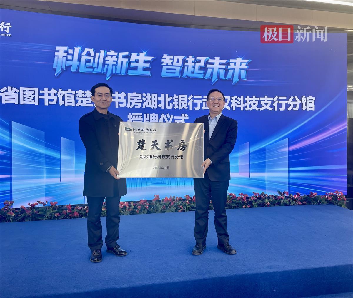 3月20日,楚天书房迎来新成员,楚天书房湖北银行科技支行分馆在武汉光谷金融港正式揭牌,该馆位于湖北银行科技支行营业厅内,向广大市民免费开放。