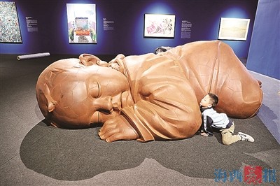 《大地之子》:清华大学美术学院雕塑系主任、雕塑家董书兵教授通过对当下大型雕塑梳理和研究,以红砂岩为主要材质,利用3D扫描获取模型数据,再分块进行3D雕刻,最后逐块雕砌安装成型的大型户外主题雕塑作品。原作是长度达15米、高4.3米、宽9米的婴儿形象。此次在厦门展览的是按照原作一定比例缩小后的作品。
