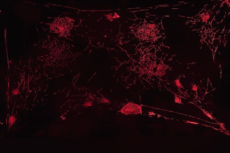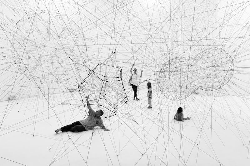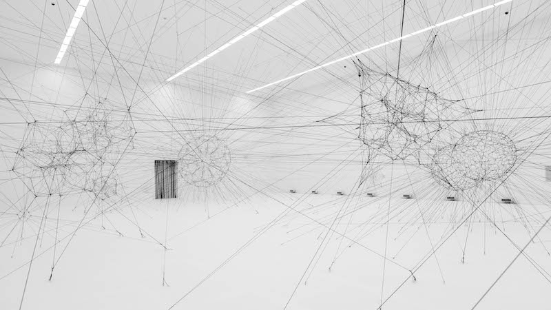 《宇宙如何陷入蛛网?》,2022。尺寸可变,激光、蛛丝、碳纤维。©托马斯·萨拉切诺。由艺术家和Arachnophilia、纽约/洛杉矶谭雅·博纳达画廊和柏林纽格赫姆施耐德画廊提供