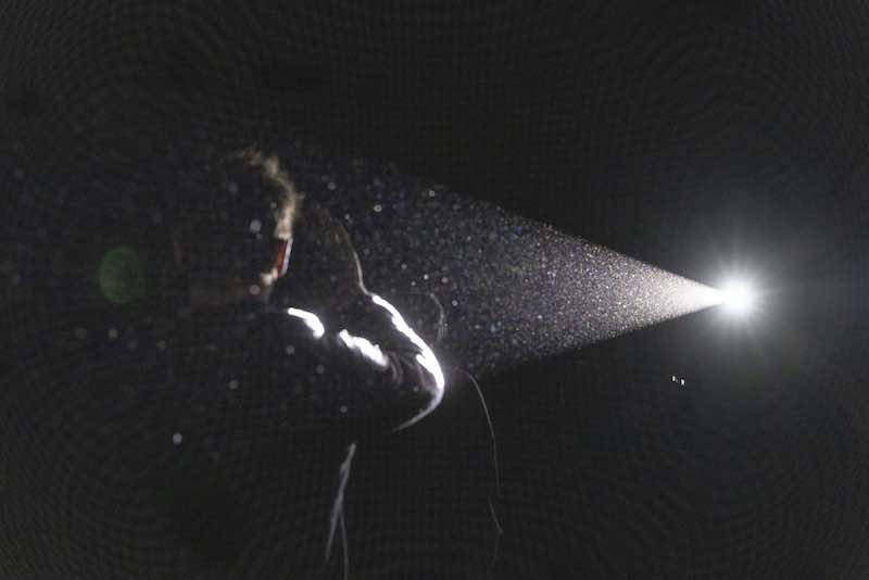 《颗粒物(质)》,2021。尺寸可变,光束、宇宙尘埃、PM2.5(颗粒物)、恒星风、气流、动觉反馈、声波。©托马斯·萨拉切诺。由艺术家、纽约/洛杉矶谭雅·博纳达画廊和柏林纽格赫姆施耐德画廊提供