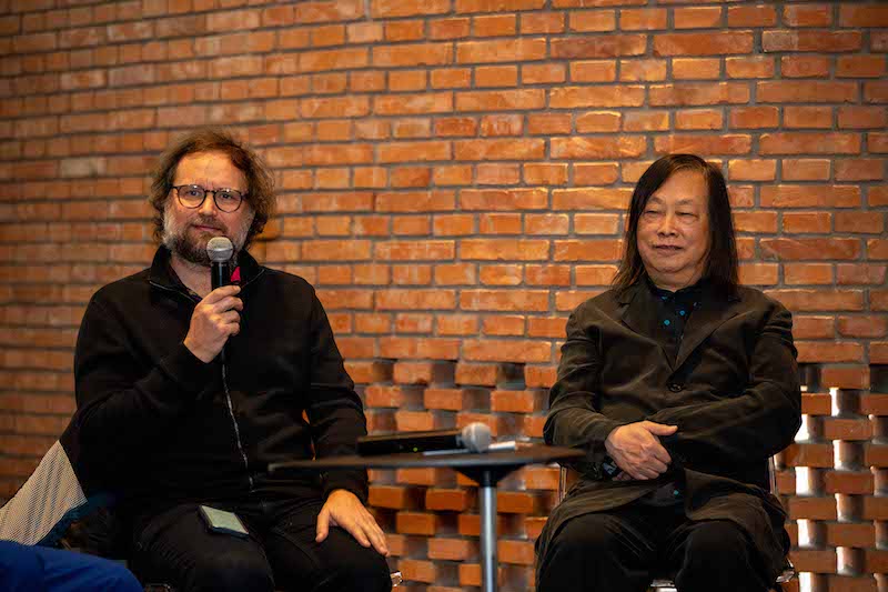 托马斯·萨拉切诺和红砖美术馆馆长、展览策展人闫士杰在新闻发布会现场