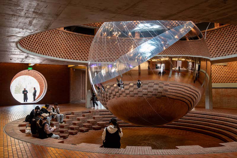 澎湃新闻记者在现场看到,在红砖美术馆进门后标志性的下沉圆厅内,首先映入眼帘的便是一个直径六米的巨大球形雕塑。这件名为《Aeroke》的雕塑,实际上是一件不使用化石燃料便达成可持续飞行的实验模型。它由镜面和透明两种不同的轻质材料制成,通过适当而不过量地吸收、保存地球表面发出的红外线辐射,换言之,仅依靠地球自身的热力学提供动力,模型可以腾空而起,从而在空中画出自身的沉浮轨迹,如同表演一支唯美的凌空舞蹈。