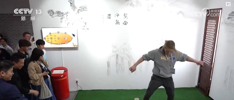 在首都体育学院,武术表演、梅花桩、咏春拳木人桩、功夫扇、舞龙、舞狮,中国学生们的精彩展示,吸引大家连连喝彩、争相体验。