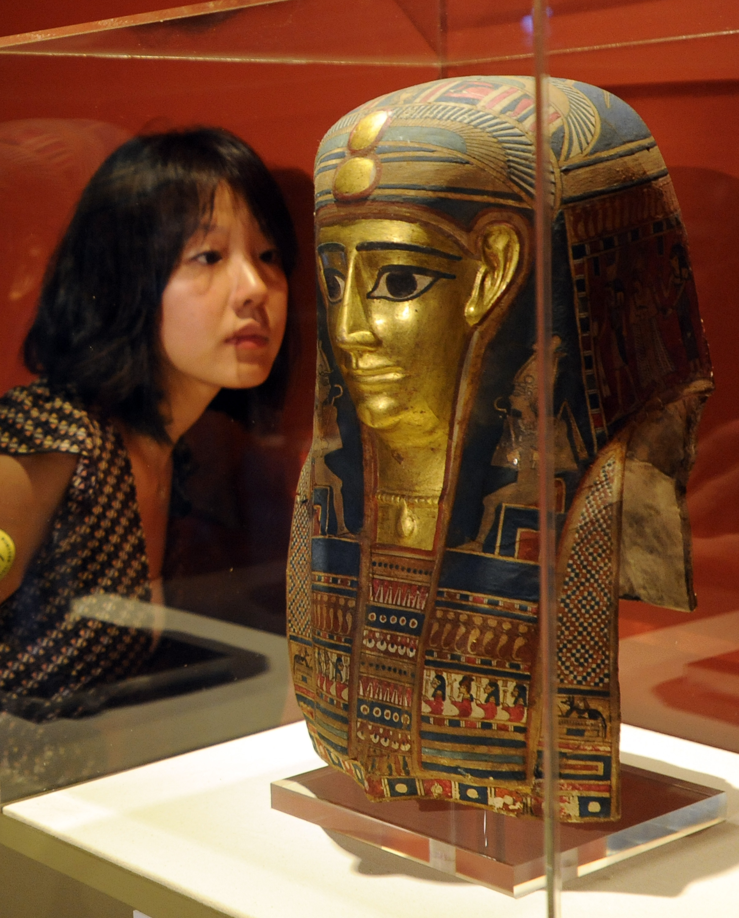 2011年6月11日,台北观众在埃及古文明特展上观看金色木乃伊面具。(新华社)
