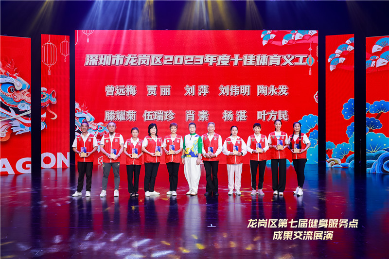 这支队伍中涌现出许多先进个人和集体。为宣扬榜样精神,传递榜样的力量,带动更多的人加入社会体育指导员公益队伍中,大会还对表现突出的个人和团队进行颁奖。龙岗区2023年度十佳体育义工、龙岗区2023年度二十佳社会体育指导员、龙岗区2023年度二十佳健身服务点负责人、龙岗区2023年度二十佳健身服务点、龙岗区2023年度社会体育指导员服务站最大进步奖、龙岗区2023年度优秀社会体育指导员服务站、龙岗区2023年度最佳社会体育指导员服务站等奖项先后揭晓。