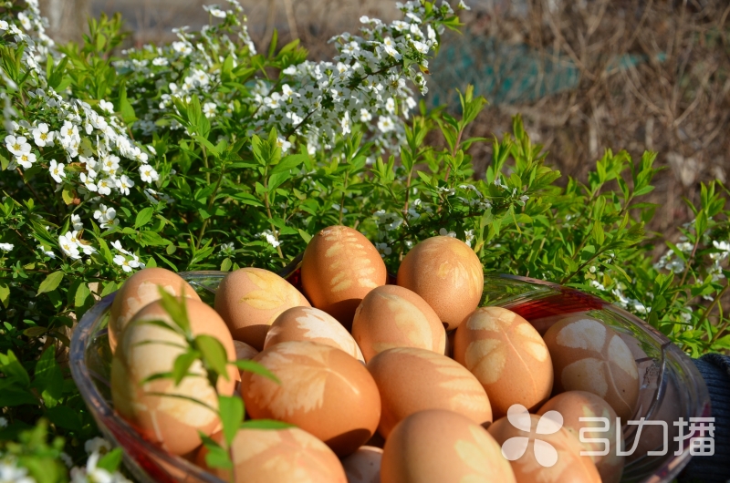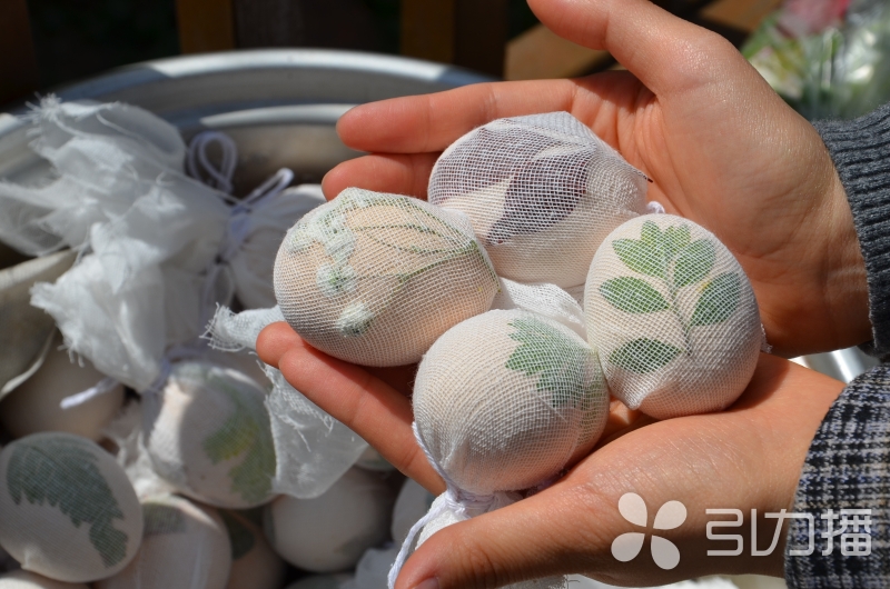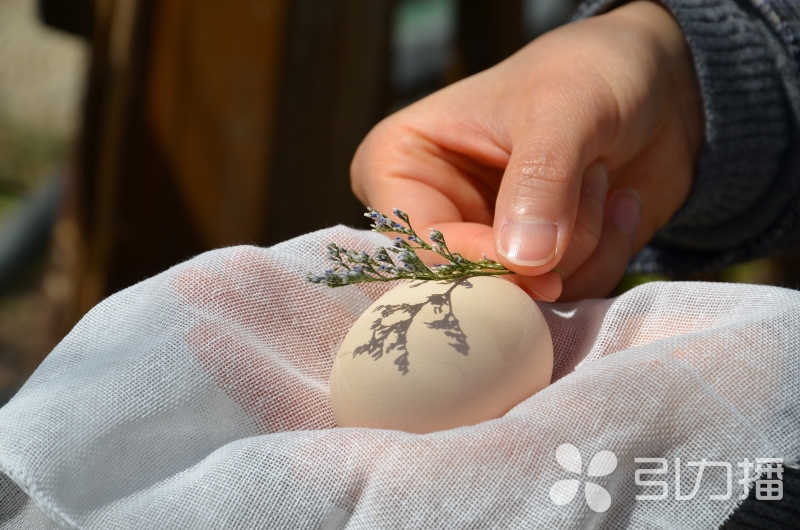 据介绍,制作“植物蛋染”时要选取各式花木树叶,将其洗净后,用纱布和线绳固定在鸡蛋上,然后将鸡蛋和植物染料一同熬煮上色。在熬煮过程中,植物的形态会渐渐留在蛋壳上,形成好看的花纹。