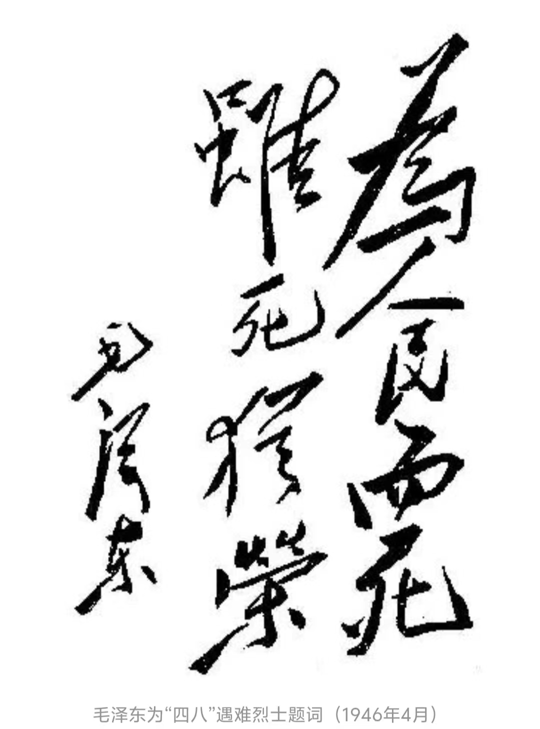 1946年4月8日,王若飞、秦邦宪(博古)、叶挺、邓发等人乘飞机返回延安途中飞机失事,机上人员全部遇难。毛泽东亲笔题写悼词“为人民而死,虽死犹荣”,周恩来含泪写下《“四八”烈士永垂不朽》的悼念文章。他们钢铁般的誓言还铮铮在耳,他们身处枪林弹雨和铁窗刑场之中的坚定不移还在眼前。他们的生命就这样戛然而止了吗?不,他们并没有死!他们都还活着,他们活在千千万万的人民心中。今天,缅怀“四八”烈士!