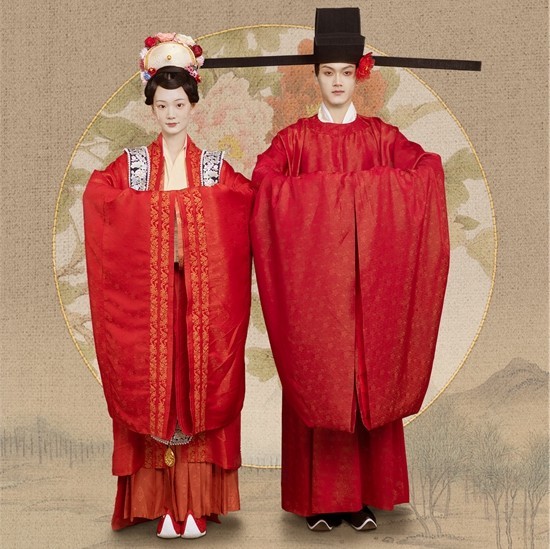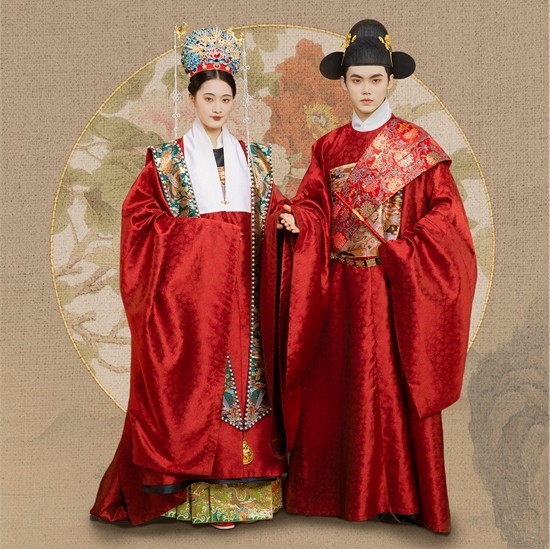 与电视剧婚服呈现不同,团队更侧重对古代婚服最大程度的精准还原和文化脉络研究。如电视剧《知否知否应是绿肥红瘦》中,明兰出嫁之时,故事背景设定为北宋时期,延续了“红男青女”的唐代婚服形式。女子身着青绿色嫁衣,男子则穿绛红色婚服。