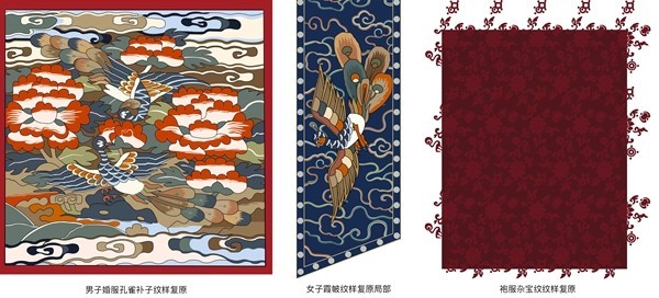 梁燕进一步解释,作为婚服中重要的展示元素——纹样的复原不仅需要考究历史文化背景,也需要思考纹样在服装上的放置位置、形式、尺寸,还要考虑当时的纺织工艺和技术背景。