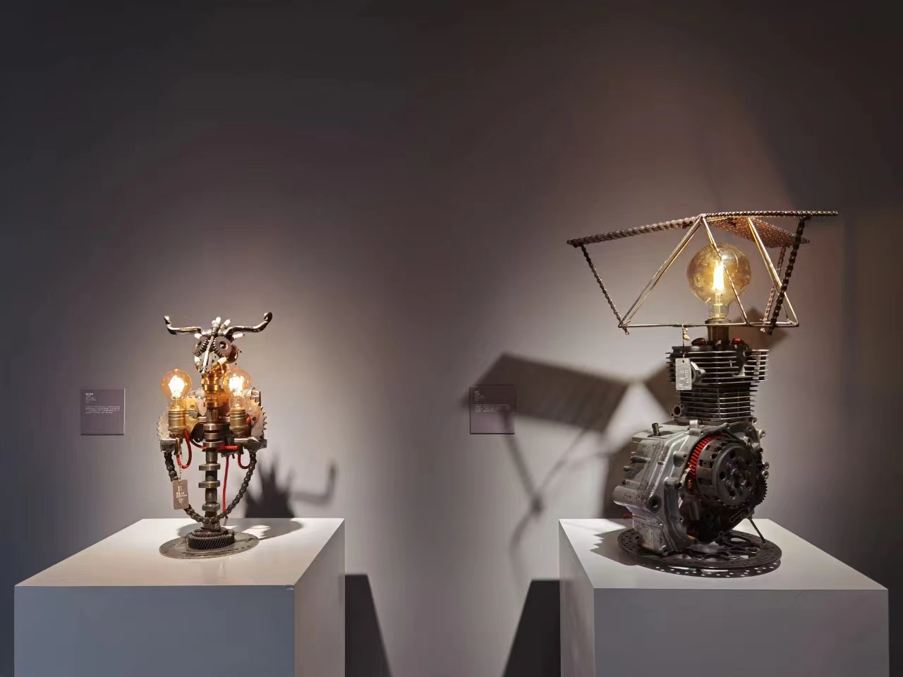 在展览上,还可以看到吴阳德用利用废旧的轴承、链条、齿轮等零件和木框架组合成的“春凳”;用报废摩托车改造而成的废土风老爷车;由废旧化油器分解重组后改造成的八音盒系列;用摩托车发动机整体改造成的台灯。展期至6月10日。(明徽)