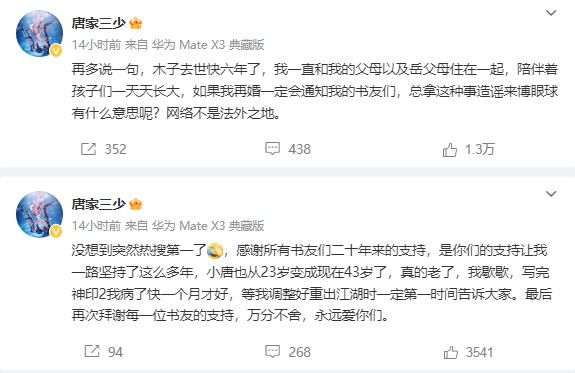 4月23日,知名网络作家唐家三少宣布“停更”,引发广泛关注和讨论。4月24日,唐家三少发文回应:“感谢所有书友们二十年来的支持,是你们的支持让我一路坚持了这么多年,小唐也从23岁变成现在43岁了,真的老了,我歇歇,写完神印2我病了快一个月才好,等我调整好重出江湖时一定第一时间告诉大家。”随后针对网友提出的再婚猜测表示,木子(已逝妻子)去世快六年了,自己一直和父母以及岳父母住在一起,陪伴着孩子们一天天长大,“如果我再婚一定会通知我的书友们,总拿这种事造谣来博眼球有什么意思呢?网络不是法外之地。”