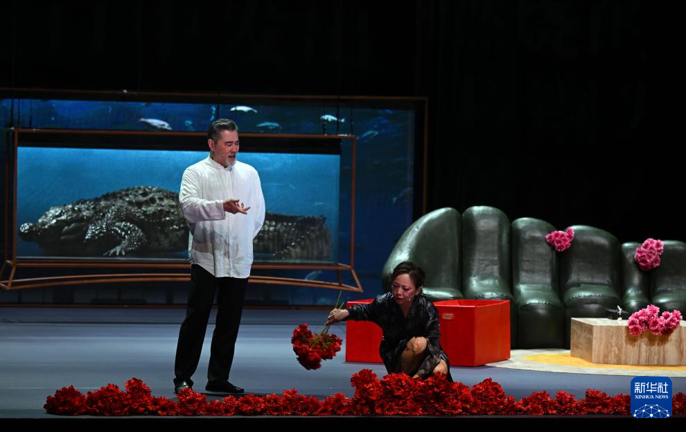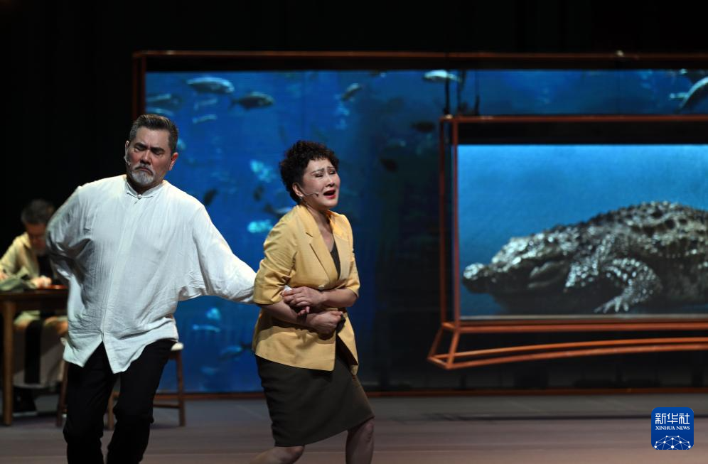 5月3日,演员赵文瑄(右)、白凯南在话剧《鳄鱼》中表演。