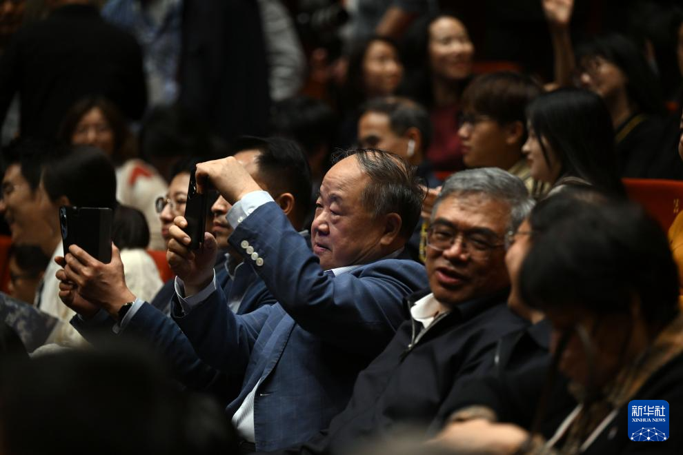 5月3日,编剧莫言在演出开始前拍摄舞台。