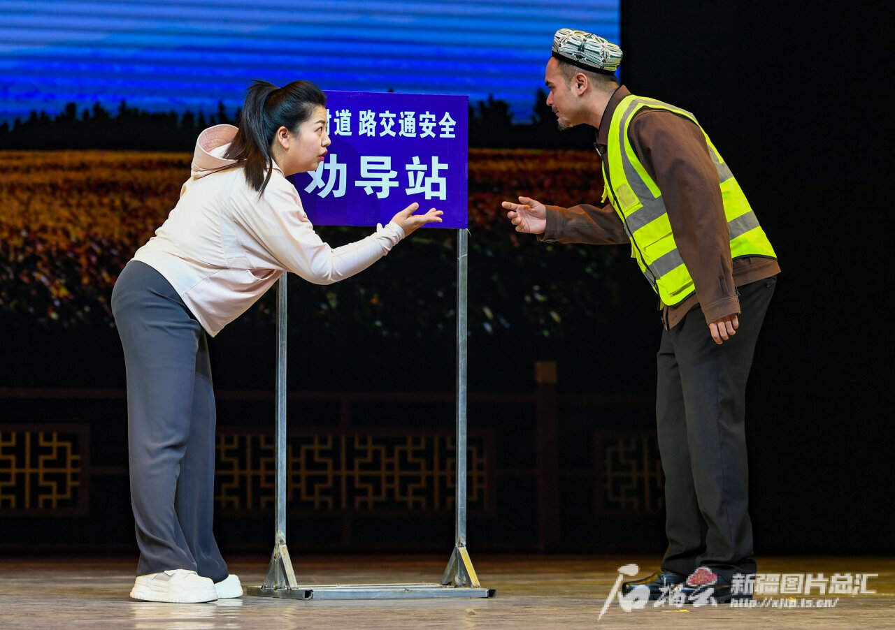 新疆艺术剧院话剧团的演员在表演小品《劝导站 》。