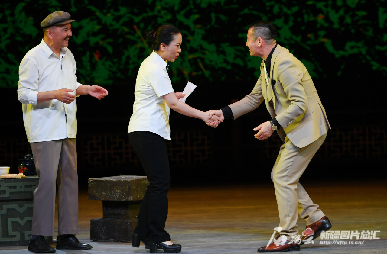 伊犁哈萨克自治州歌舞剧院的演员在表演小品《村里的故事》。