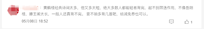对于背诵哪些诗词网友也是展开了讨论,有网友表示黄鹤楼经典诗词太多,其中有名的是崔颢的《黄鹤楼》和李白的《黄鹤楼送孟浩然之广陵》,但又多太短,绝大多数人都能轻易背完,起不到筛选作用,不像岳阳楼,滕王阁太长,一般人还真背不完。认为可以多背几首,给减免券。