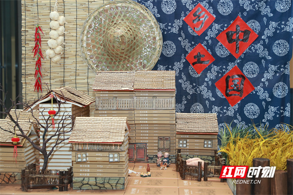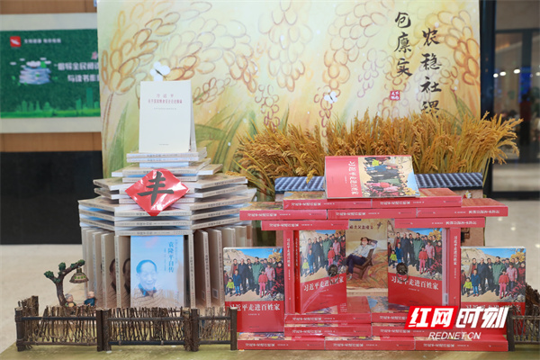 常德市新华书店展示主题书花《仓廪实·农稳社稷》。整体造型由天下粮仓、杂交水稻稻田和农家大院三个主体元素组成,寓意看似平凡的一粒粮食,却有着特殊的分量。