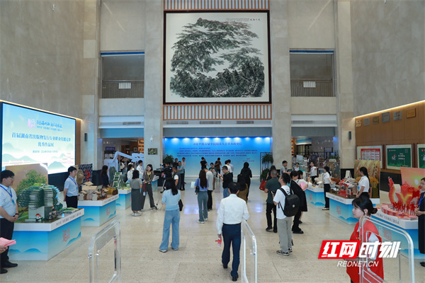 株洲市新华书店展示主题书花《一路有茶香》。草头为茶叶,木底为清山,人字做支撑。绿、白、黄、红、黑,茶叶五色,湖南一样不缺。三湘四水五彩茶,也由此广为流传。