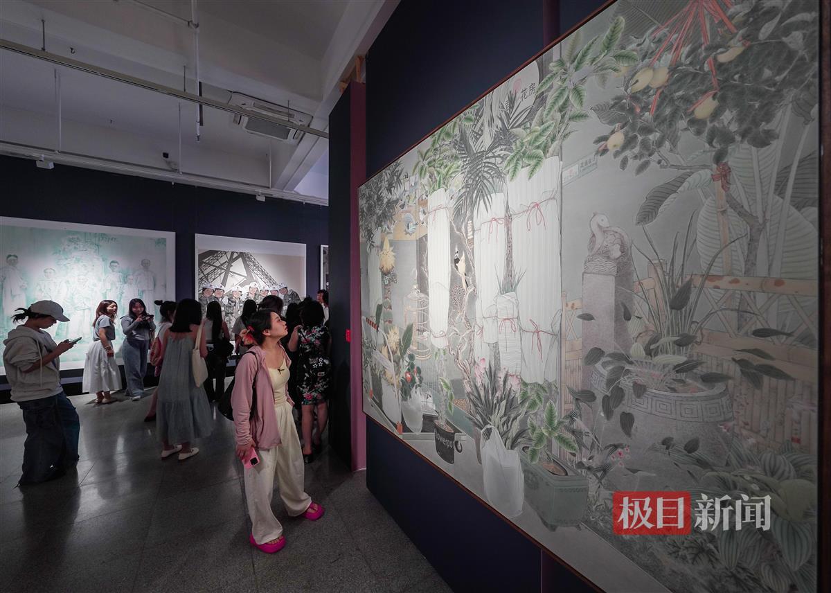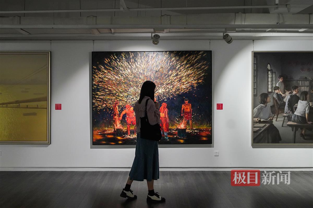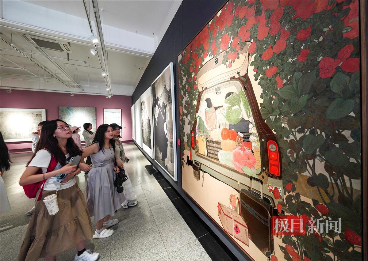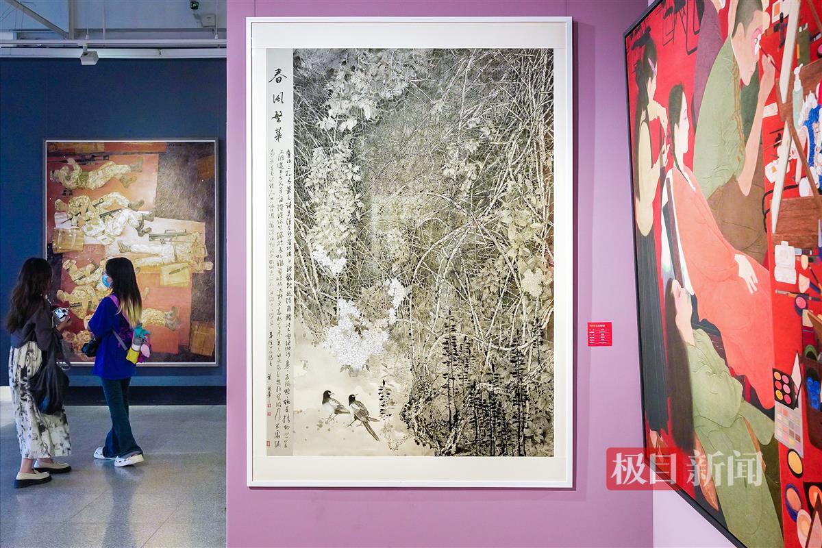 极目新闻记者在现场看到,本次参展作品多为大画幅,加上展厅内布局紧凑,信息量相当密集。“一走进来,感觉各种风格的作品扑面而来。”一位观展市民笑称,“一时之间好像两只眼睛不够用。”