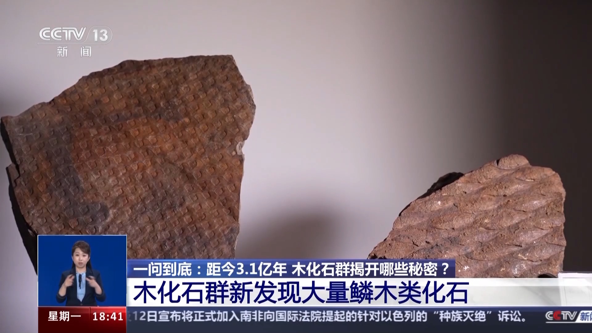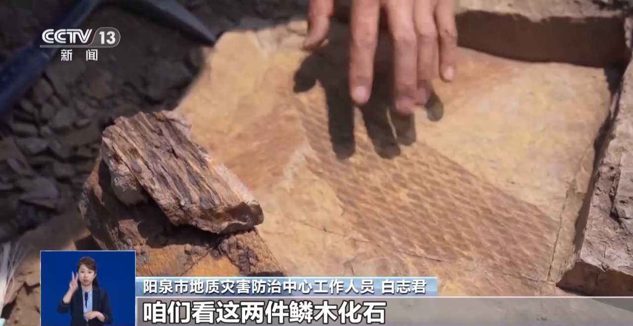 总台记者 崔肖冉:这两块就是刚从发掘现场采集的鳞木化石,用手摸一下,一片挨着一片,凹凸不平。我们还发现一个非常有趣的现象,它们的排列方式各不相同,一个是竖着的,而另一个是横着的。
