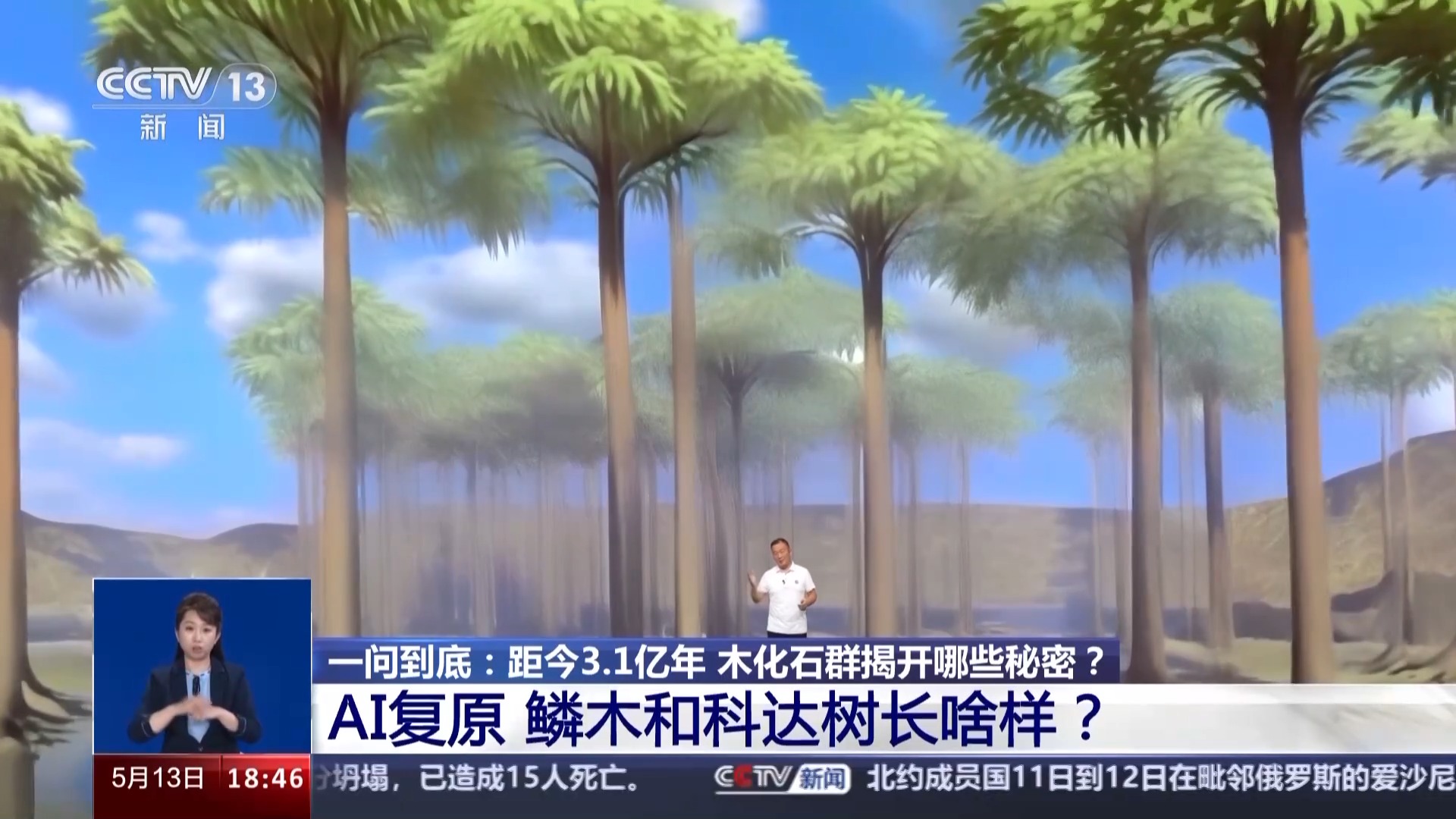 3.1亿年前的树木到底长啥样?记者依据科研人员提供的相关数据信息和参考图,通过AI技术复原了3.1亿年前的鳞木和科达树的树干。