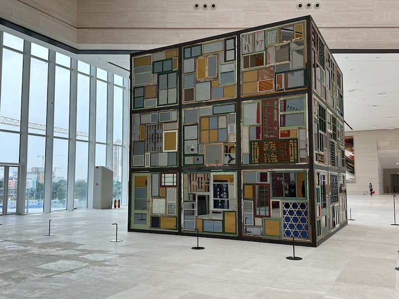 在展览中,尤为令人瞩目的是艺术家尹秀珍《可携带的城市》系列作品共展出12件,是目前在国内最为全面的一次展出。艺术家将相应城市居民穿过的衣物在一个手提旅行箱中制作“城市”,将衣物上个人化的情感和历史留存与钢筋混凝土的城市空间转换,从而以一种更富有人文关怀的视角对现代都市进行了多层次和深度化的阐释和表达。这些规格一样的箱子被一起展出,颇具“联合国”的气势,也呼应着“城市链”的主题。