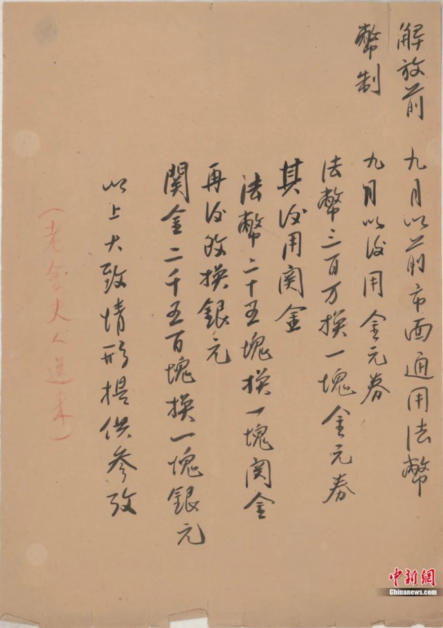 解放前钱币兑换手稿。北京人民艺术剧院供图